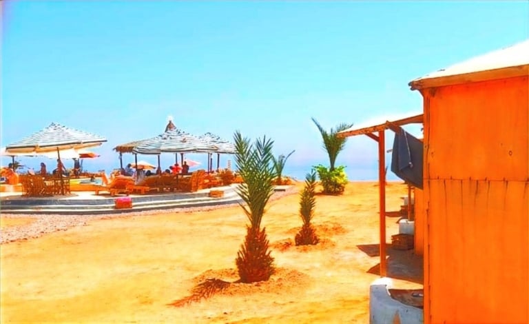Der Swimmingpool unseres Beach Camps bietet einen atemberaubenden Blick auf das Rote Meer und schafft ein ruhiges und faszinierendes Ambiente. Das kristallklare Wasser lädt Sie zu einem erfrischenden Bad ein und Sie können die herrliche Umgebung genießen. Umgeben von Sonnenschirmen und Liegestühlen ist unser Poolbereich die perfekte Oase der Entspannung.